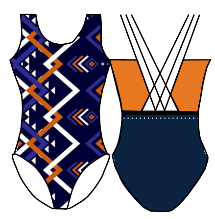 Aubie – Make a statement in this bold, college-inspired leotard. The deep navy base is accented with a striking geometric pattern of interlocking triangles and diamonds in blue, white, and sand, giving it a dynamic, eye-catching look. The back features an open design with multiple thin black straps that crisscross and connect to the sides, adding a sleek, athletic finish. Perfect for athletes who want a standout style that combines school pride with modern flair