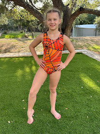 Step into the shadows with Web of Dread — a striking gymnastics leotard that weaves fiery orange, ember red, and midnight black into a tangled web of fearsome elegance. Inspired by the ominous beauty of spiderwebs at dusk, this leotard is made for the gymnast who isn’t afraid to command attention.